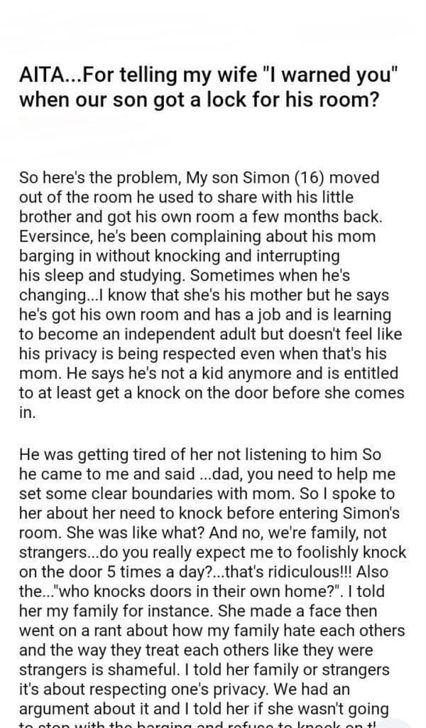 AITA…For telling my wife “I warned you” when our son got a lock for his room?