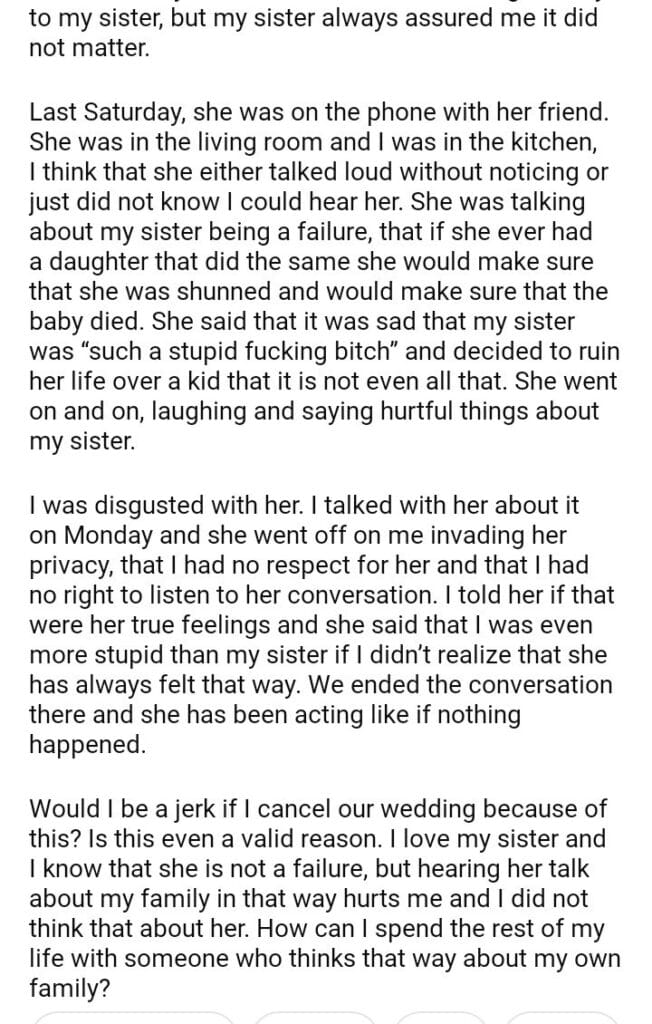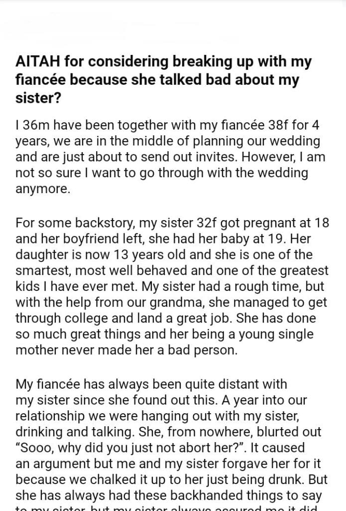 AITAH for my fiancée because she talked my sister?