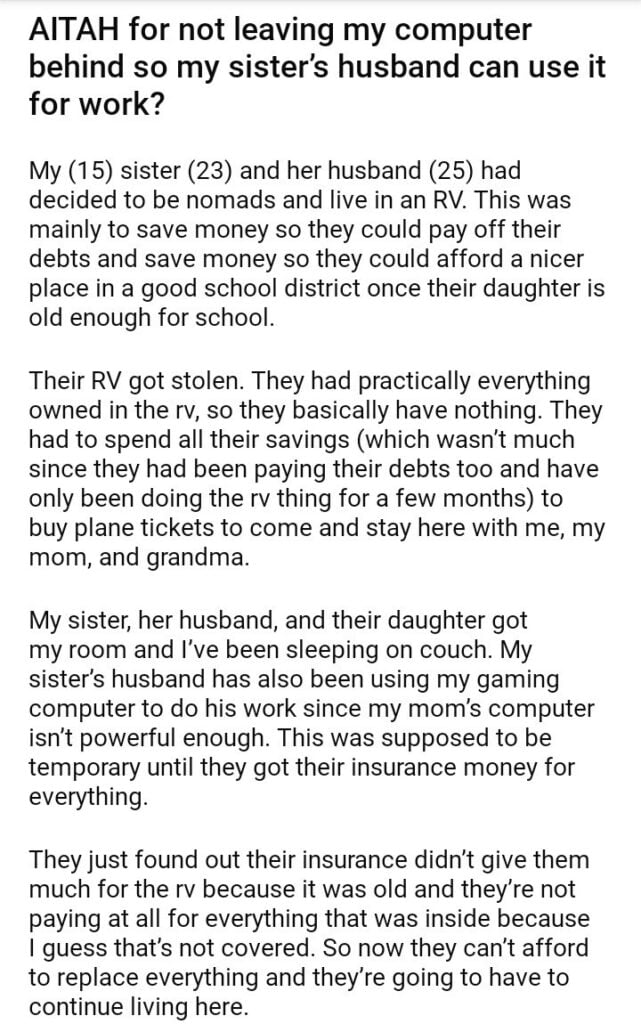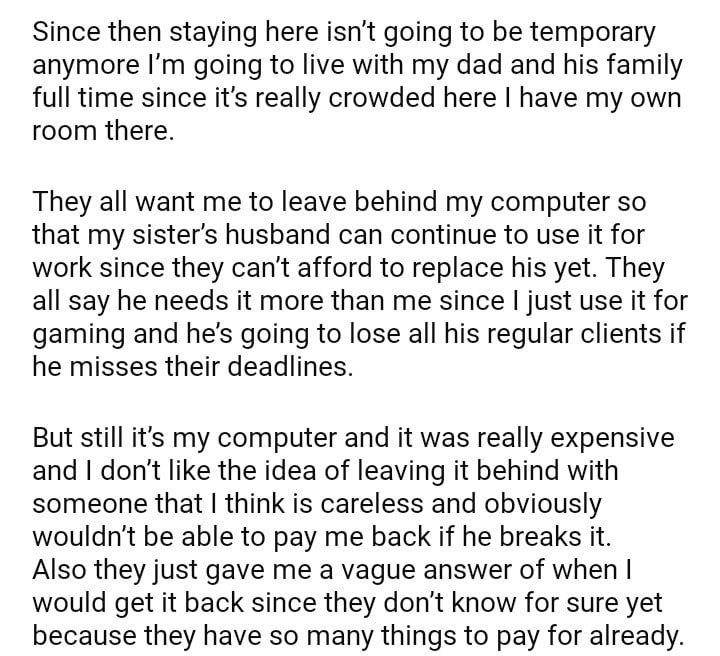 AITAH for not leaving my computer behind so my sister’s husband can use it for work?