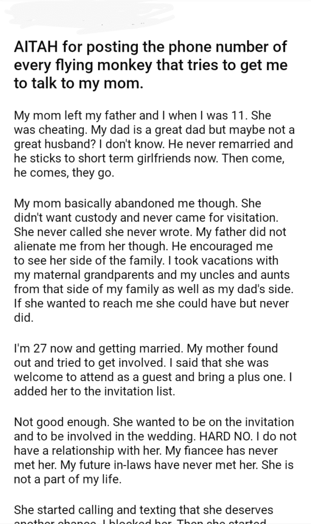 AITAH for posting the phone number of every flying monkey that tries to get me to talk to my mom.