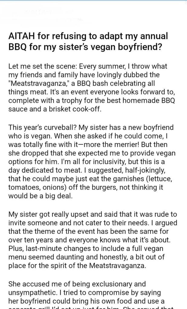 AITAH for refusing to adapt my annual BBQ for my sister’s vegan boyfriend?