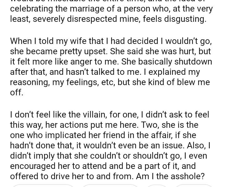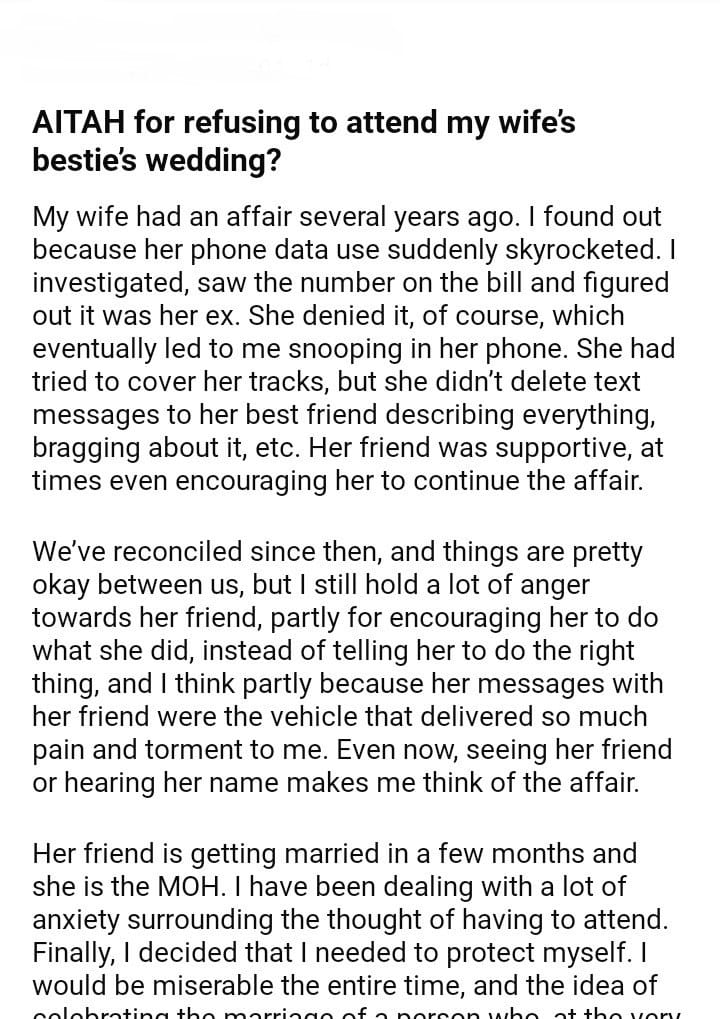 AITAH for refusing to attend my wife’s bestie’s wedding?