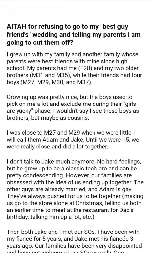 AITAH for refusing to go to my “best guy friend’s” wedding