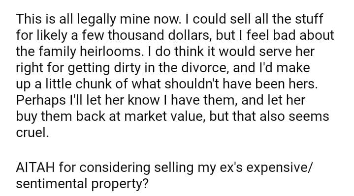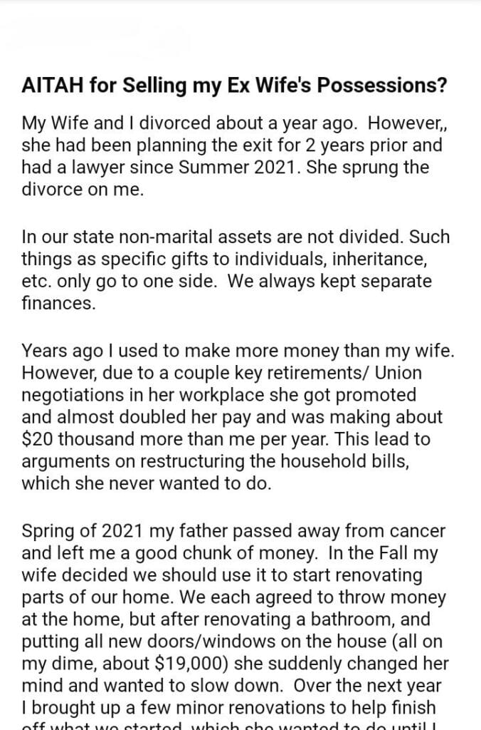 AITAH for Selling my Ex Wife’s Possessions?