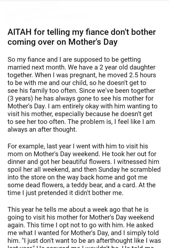AITAH for telling my fiance don’t bother coming over on Mother’s Day