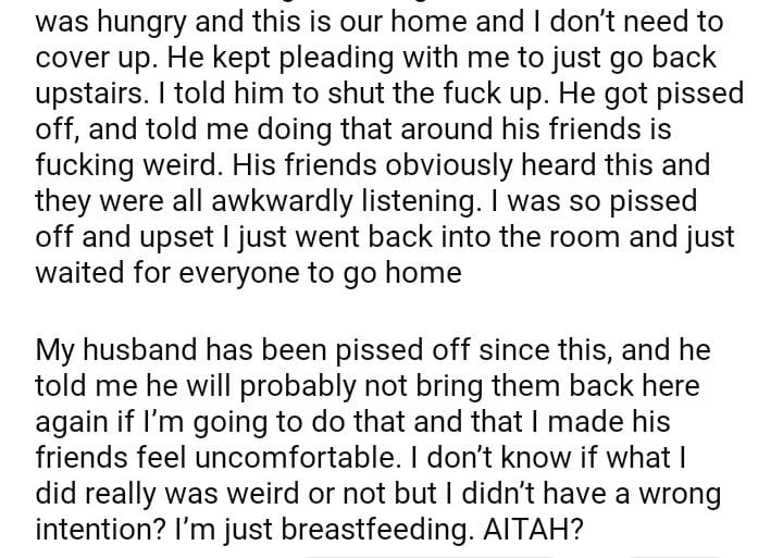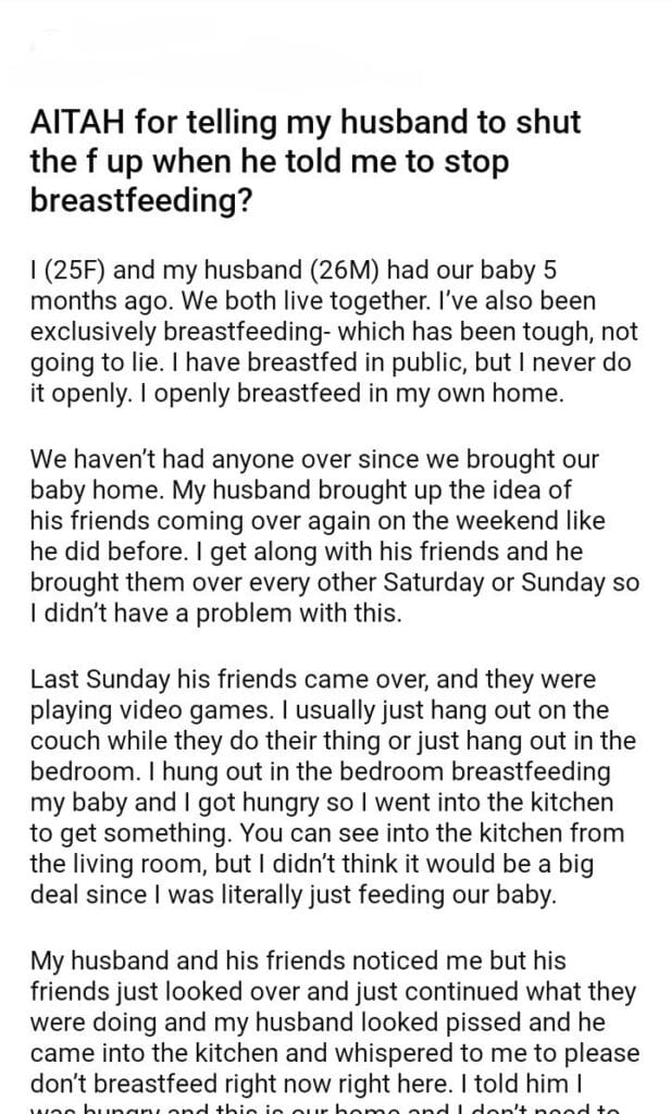 AITAH for telling my husband to shut the f up when he told me to stop breastfeeding?