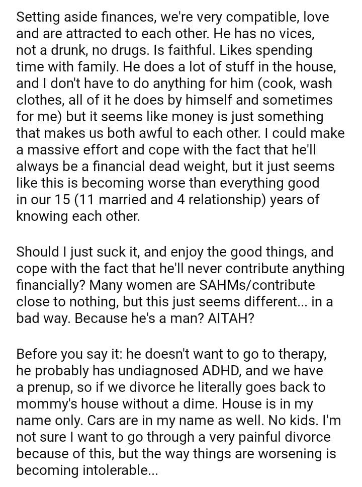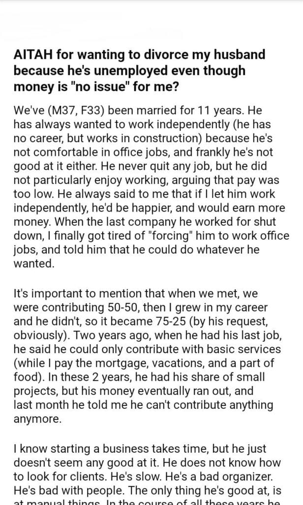AITAH for wanting to divorce my husband because he’s unemployed