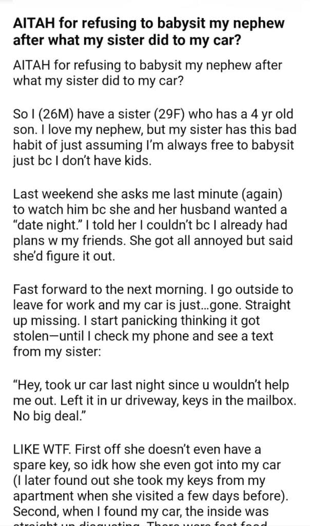 AITAH for what my sister did to my car?