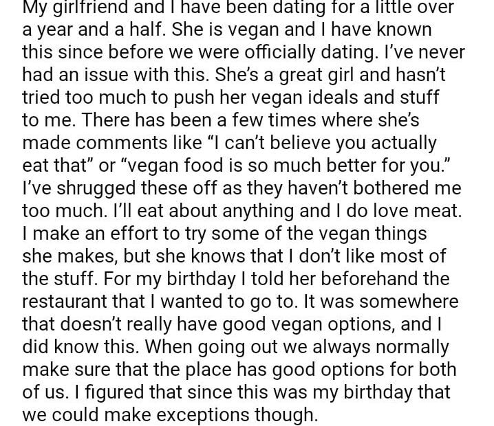 AITA for refusing to eat the vegan meal that my girlfriend made me for my birthday?July 23, 2024July 23, 2024AITA