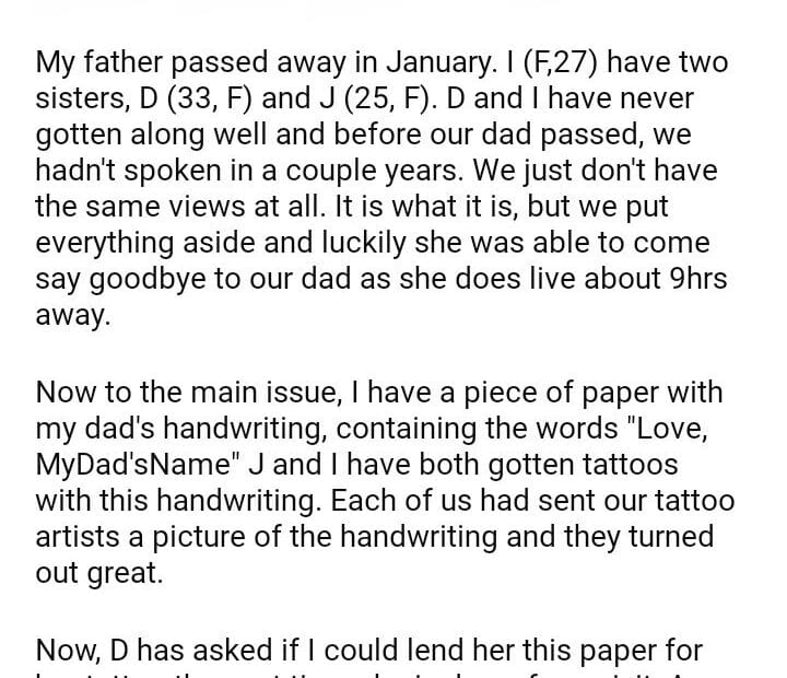 AITAH for refusing to lend my sister a piece of our father’s handwriting