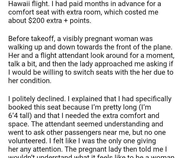 AITA for Refusing to Give My Seat for a Pregnant Woman on a 12hr Flight?June 28, 2024June 28, 2024AITA