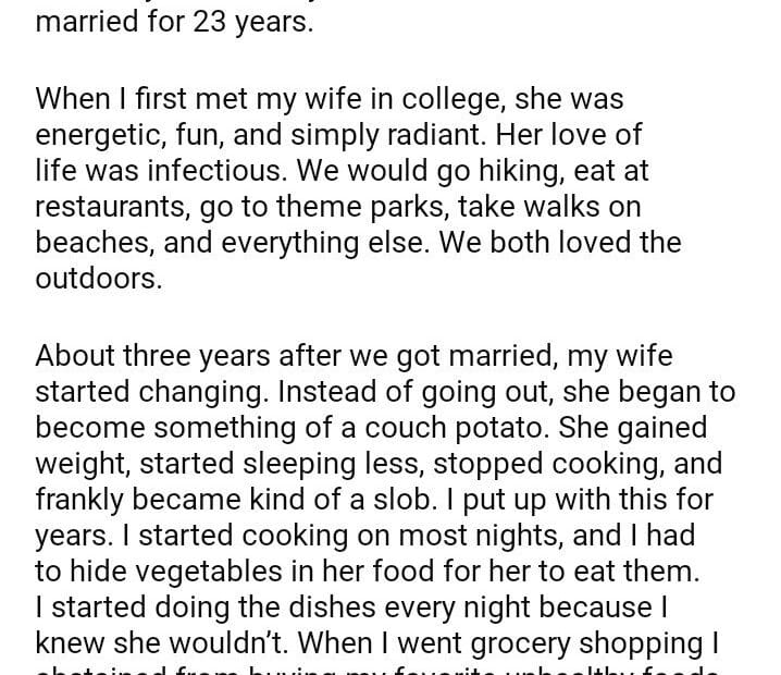 AITAH for divorcing my wife if she didn’t start taking care of herself?June 29, 2024June 29, 2024AITA