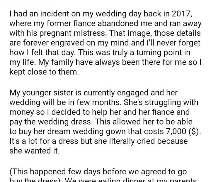 AITA for backing out of paying for my sister’s wedding dress over a “joke” she made?June 16, 2024June 16, 2024AITA