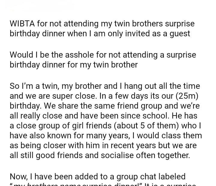 WIBTA for not attending my twin brothers surprise birthday dinner when I was only invited as a guestJune 14, 2024June 14, 2024AITA