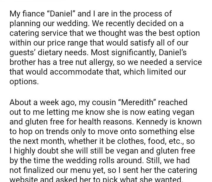 AITA for refusing to change catering services to accommodate my vegan, gluten free cousin?June 13, 2024June 13, 2024AITA