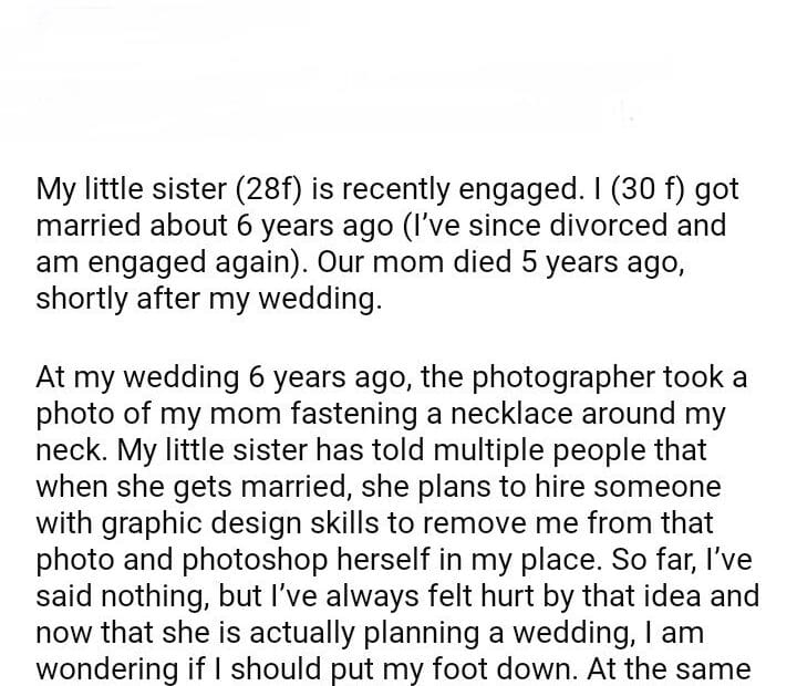 WIBTA for telling my little sister she can’t remove me from my wedding photoMay 23, 2024May 23, 2024AITA