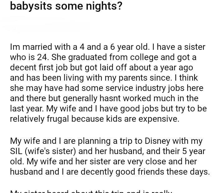 AITAH for only letting my sister tag along our Disney vacation if she babysits some nights?May 23, 2024May 23, 2024AITA