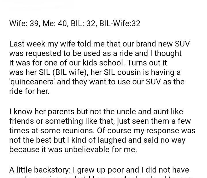 AITA for telling my wife that her SIL could not use our brand new SUVApril 13, 2024April 13, 2024AITA