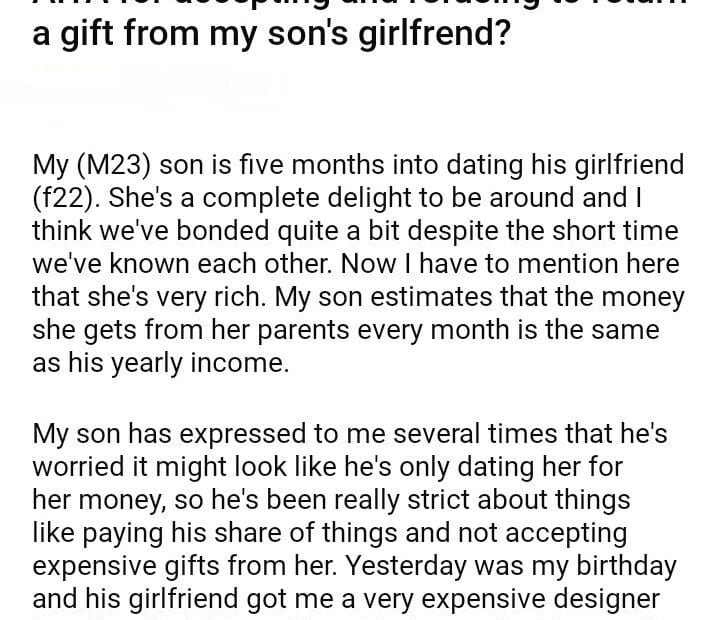 AITA for accepting and refusing to return a gift from my son’s girlfrend?April 8, 2024April 8, 2024AITA