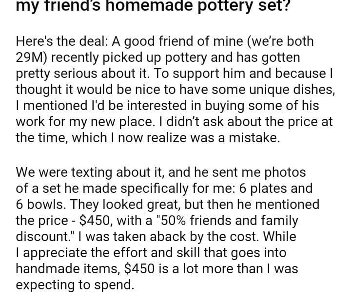AITA for not wanting to spend $450 on my friend’s homemade pottery set?April 4, 2024April 4, 2024AITA