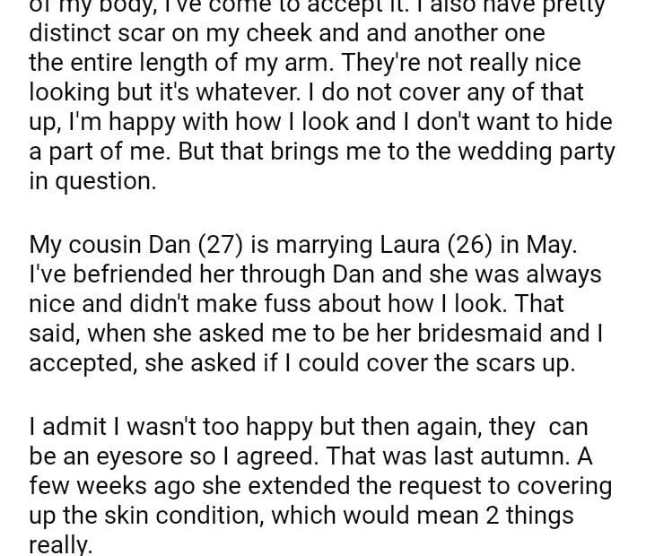 AITA for dropping out of a wedding after being told to cover up some scarsMarch 9, 2024March 9, 2024AITA
