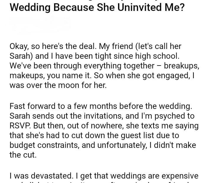 AITA for Refusing to Pay for My Friend’s Wedding Because She Uninvited Me?March 10, 2024March 10, 2024AITA