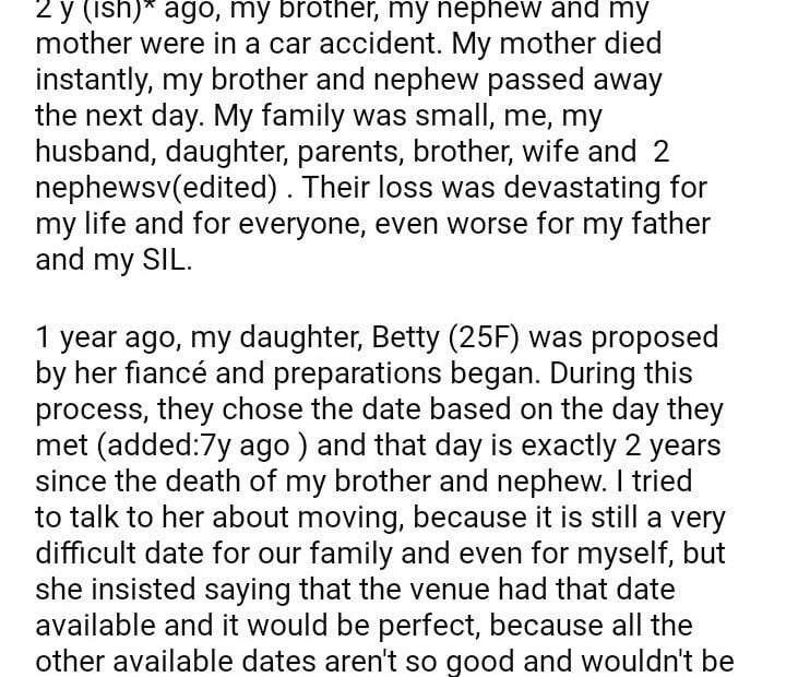 AITA telling my daughter she has to understand that choosing this wedding date would result in my family not going?February 22, 2024February 22, 2024AITA