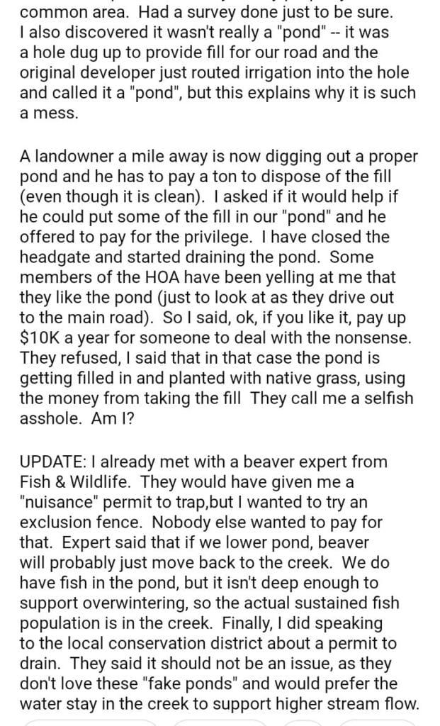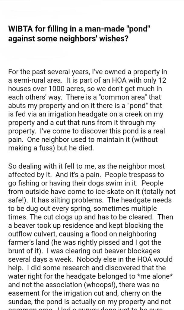 WIBTA for filling in a man-made “pond” against some neighbors’ wishes?