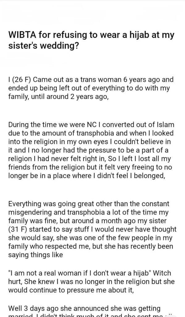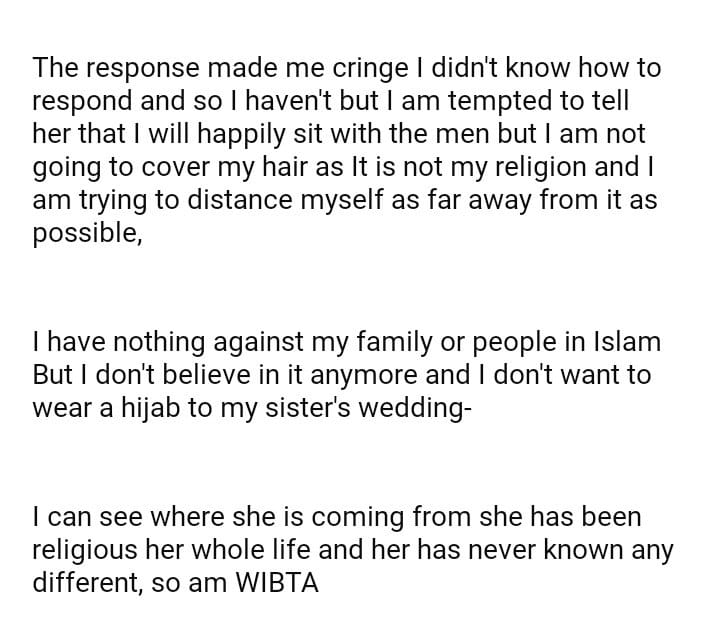 WIBTA for refusing to wear a hijab at my sister’s wedding?