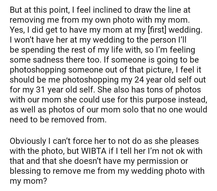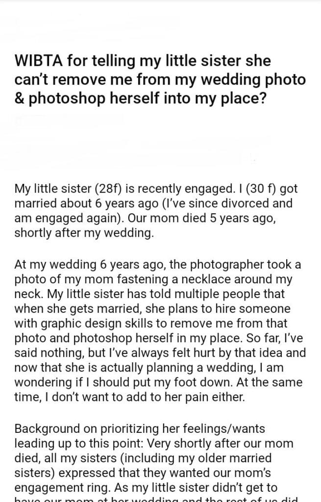 WIBTA for telling my little sister she can’t remove me from my wedding photo