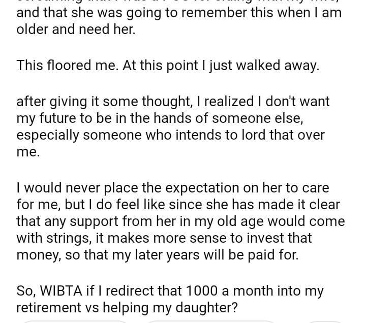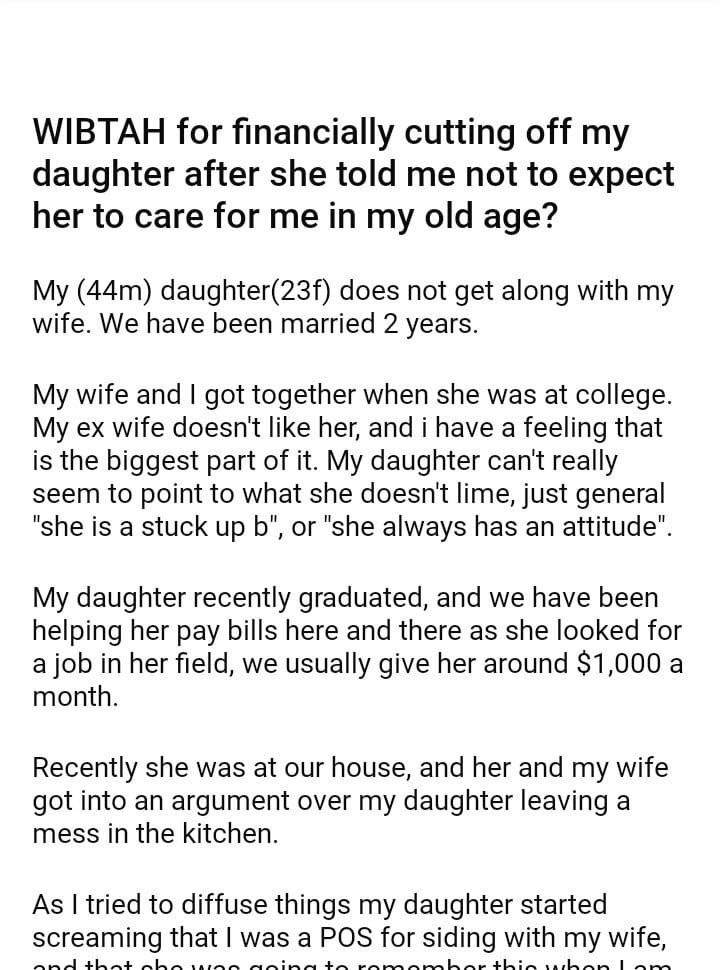 WIBTAH for my daughter after she told me not to expect her to care for me in my old age?