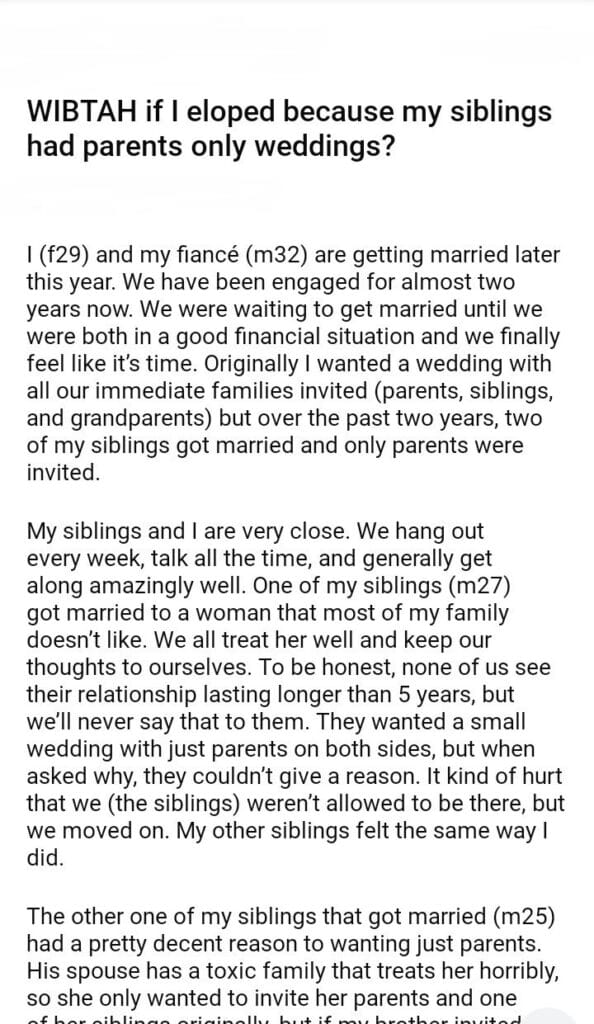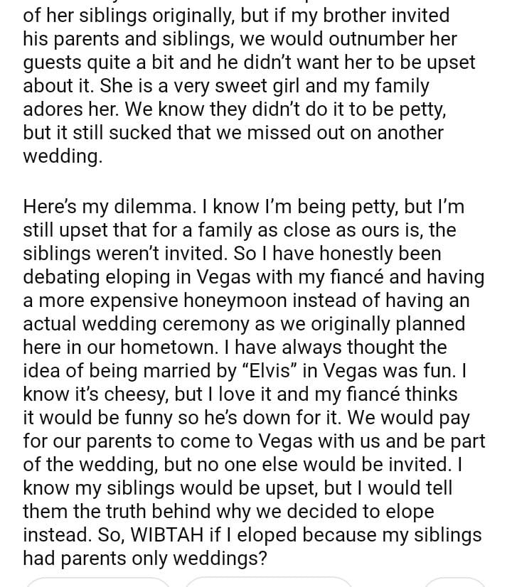 WIBTAH if I eloped because my siblings had parents only weddings?